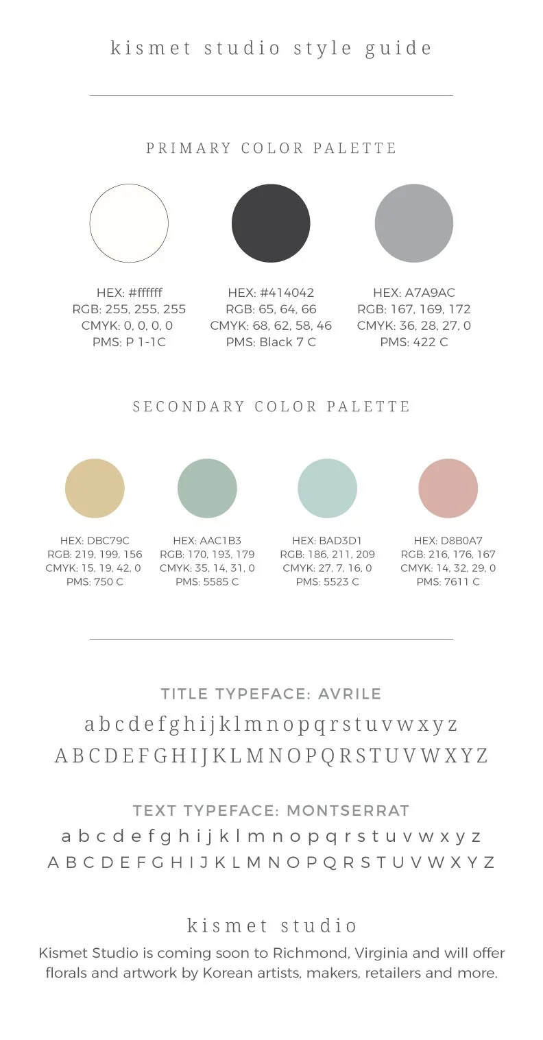 Project Objective: Sarah Choi is a marketing consultant and has helped many of her clients successfully launch their own businesses in the last 10 years. She is now launching her own project, Kismet Studio. This project will be a retail space based in Richmond, Virginia and will feature florals, artwork by Korean artists, books, a Korean-style tea area, and spaces for meetings or workshops. Sarah wanted a clean, fresh and minimal aesthetic that also represented her colorfully and visually. The space is soft and features plenty of open space for comfort and gathering.
