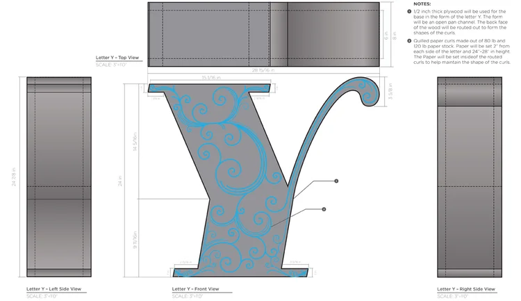 Rendering and dimension plan for my letter Y.